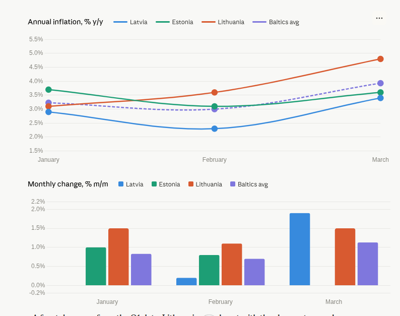 - Lithuania: annual inflation stood at 3.1% in January, 3.6% in February, 4.8% in March; monthly change was +1.5%, +1.1%, +1.5%.